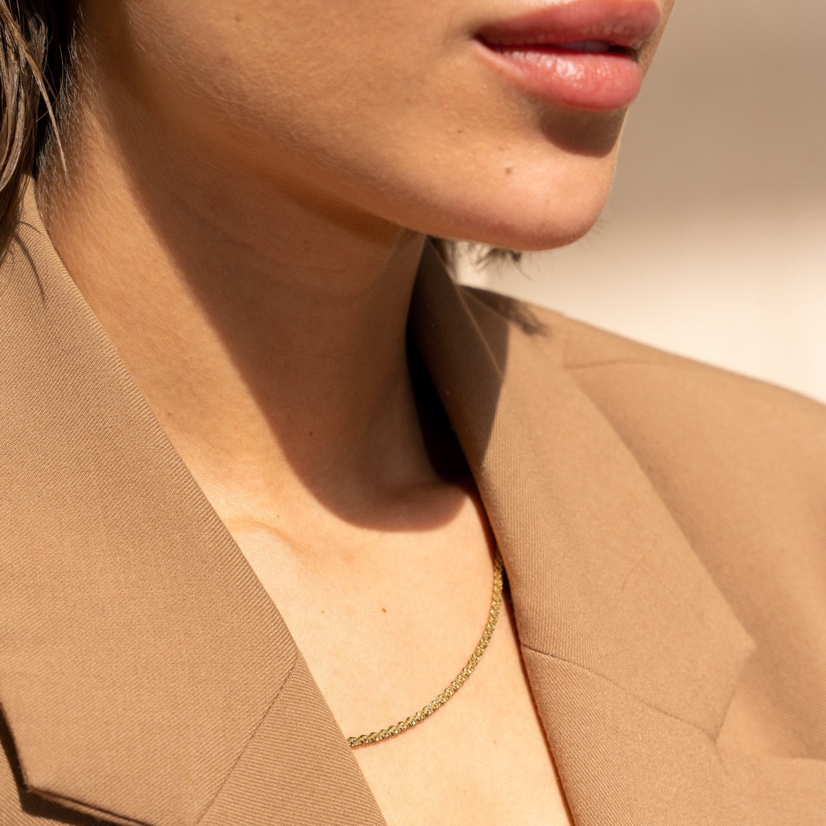 An elegant and versatile design that enhances any look — the Champagne Chain Necklace is crafted from 316L stainless steel with 14K gold plating, measuring 38 cm with a 5 cm extender and a 2.4 mm width.